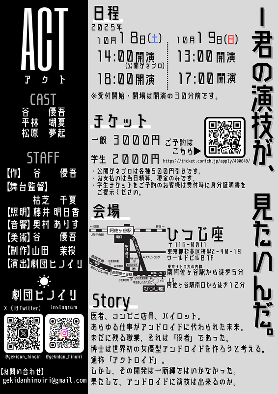 | スタッフ | 【舞台監督】枯芝千夏 【照明】藤井明日香 【音響】奥村ありす 【美術】谷優吾 【制作】山田茉桜 【演出】劇団ヒノイリ |